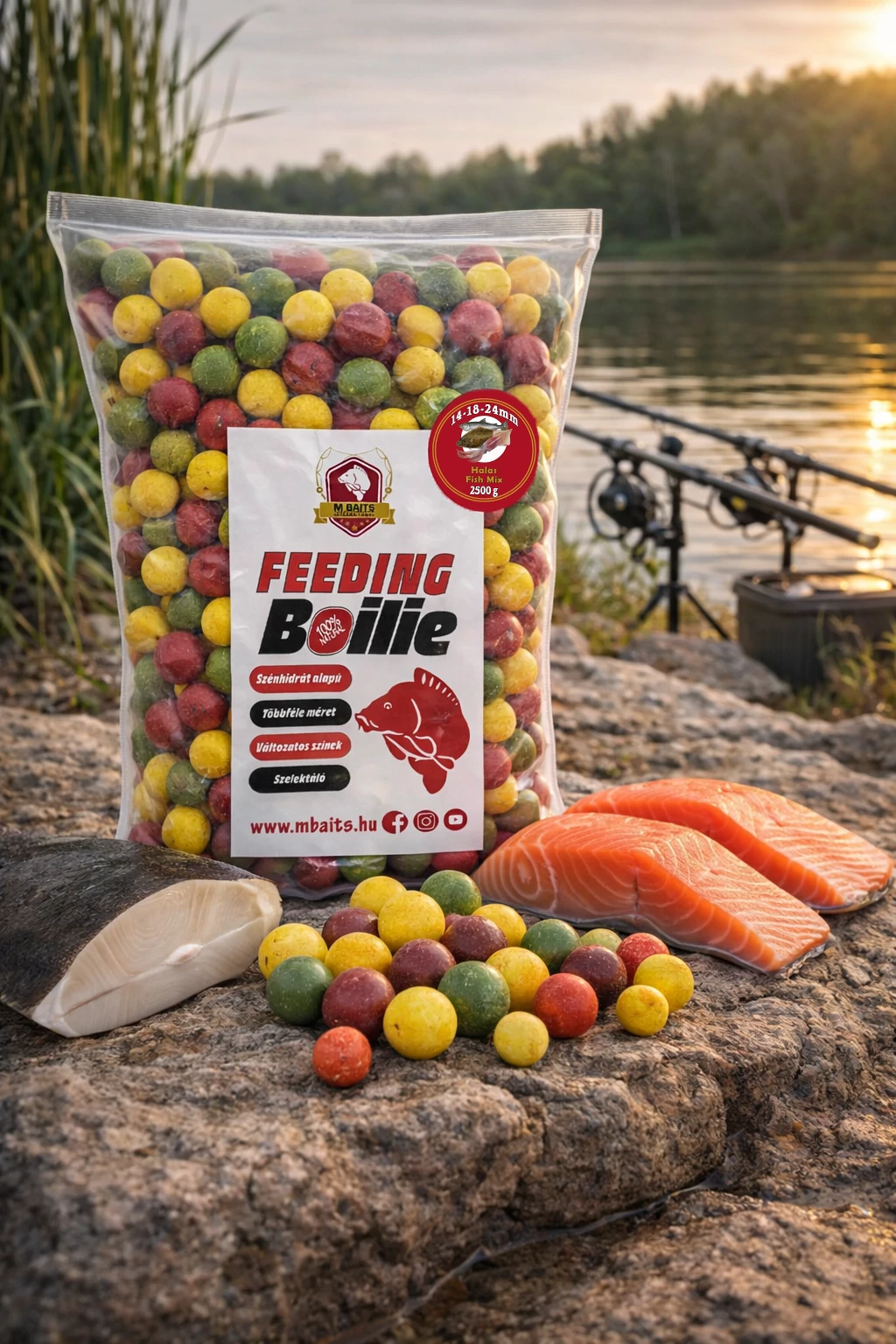 Etetésre néha nem csak oldódó, de főzött bojli is kell, erre nyújt megoldást a Feeding bojli mix. Ez a termék, különböző méretű golyókat tartalmaz, hisz van benne vegyesen 14-18-24mm-es is, valamint az eltérő színek jobban fel tudja kelteni a halak figyelmét bármilyen mederviszony esetén is.
